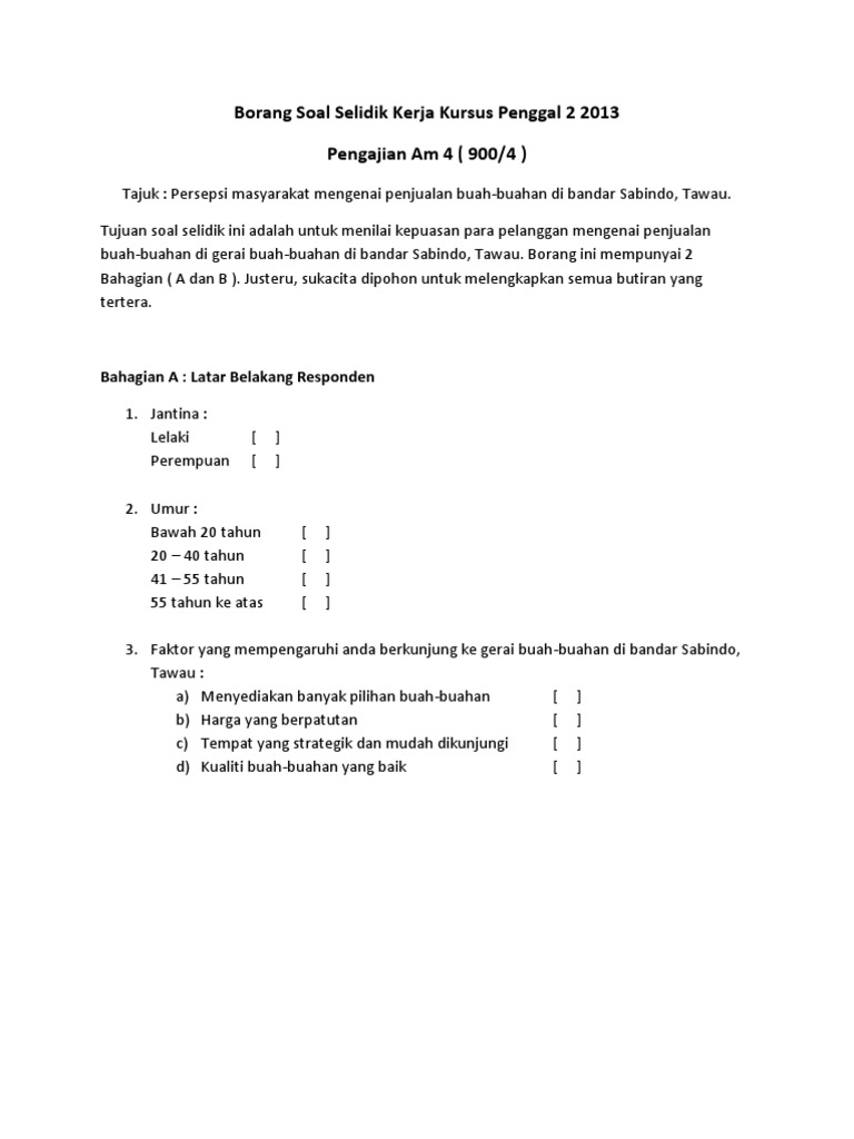 Contoh Borang Soal Selidik Pengajian Am Tingkatan 6 from imgv2-1-f.scribdassets.com Borang soal selidik pengajian am. Segala maklumat yang diberikan akan dirahsiakan dan ia akan hanya digunakan bagi. Doc borang soal selidik kerja kursus pengajian am kod mata pelajaran 900 4 stpm tahun 2017 hivalini tr academia edu. Borang soal selidik akan dianalisis menggunakan bilangan, partus dan min. Doc borang soal selidik kerja kursus pengajian am kod mata pelajaran 900 4 bahagian a data demografi responden chrys annie rayvious academia edu. Contoh soalan kaji selidik pengajian am stpm, contoh soalan kaji selidik pengajian am perlembagaan, contoh soalan kaji selidik pengajian am kerja, contoh soalan kaji selidik pengajian am bab, contoh soalan kaji selidik pengajian am penggal 3, contoh soalan kaji selidik pengajian anwar, contoh soalan kaji. Borang soal selidik dan sesi temu bual akan dianalisis dan dipersembahkan dalam bentuk jadual, graf atau carta pai. Contoh soalan soal selidik pengajian am.