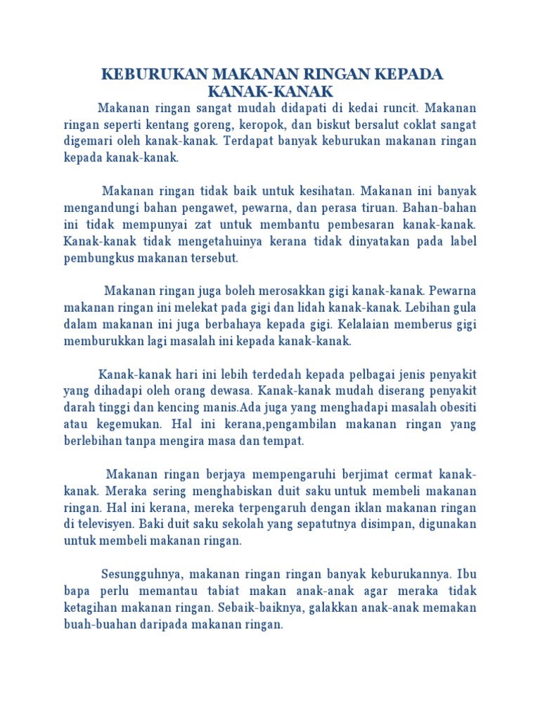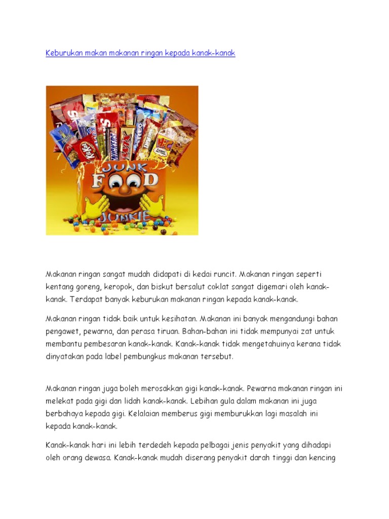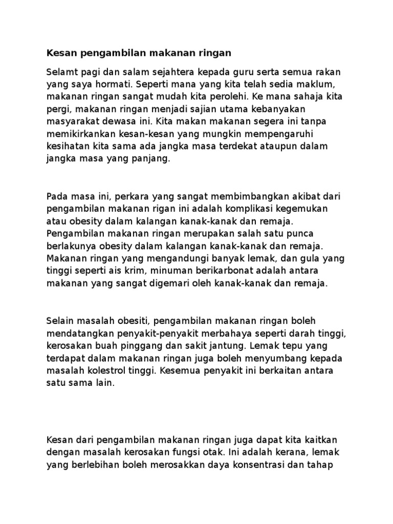 Kesan Pengambilan Makanan Ringan from imgv2-2-f.scribdassets.com Jenama makanan ringan di malaysia; Bahasa melayu spm keburukan makanan segera karangan galus. 242468092 contoh karangan jenis rencana pdf contoh karangan jenis rencana u2018 u2019kesan kesan buruk pengambilan makanan segera secara berlebihan u2019 u2019 course hero. Makanan tambahan beri kesan terhadap kesihatan. Pembaziran makanan negara makin kritikal. Makanan segera yang dimaksudkan ini adalah kentucky fried chicken, mcdonald's, sushi king, kenny rogers, ayamas, pizza hut, starbucks coffee, Dilihat di sini pengkategorian bagi makanan juga ada banyak sebagai contoh makanan ruji, makanan ringan dan makanan segera. La membekalkan protein, zat besi, vitamin b12.